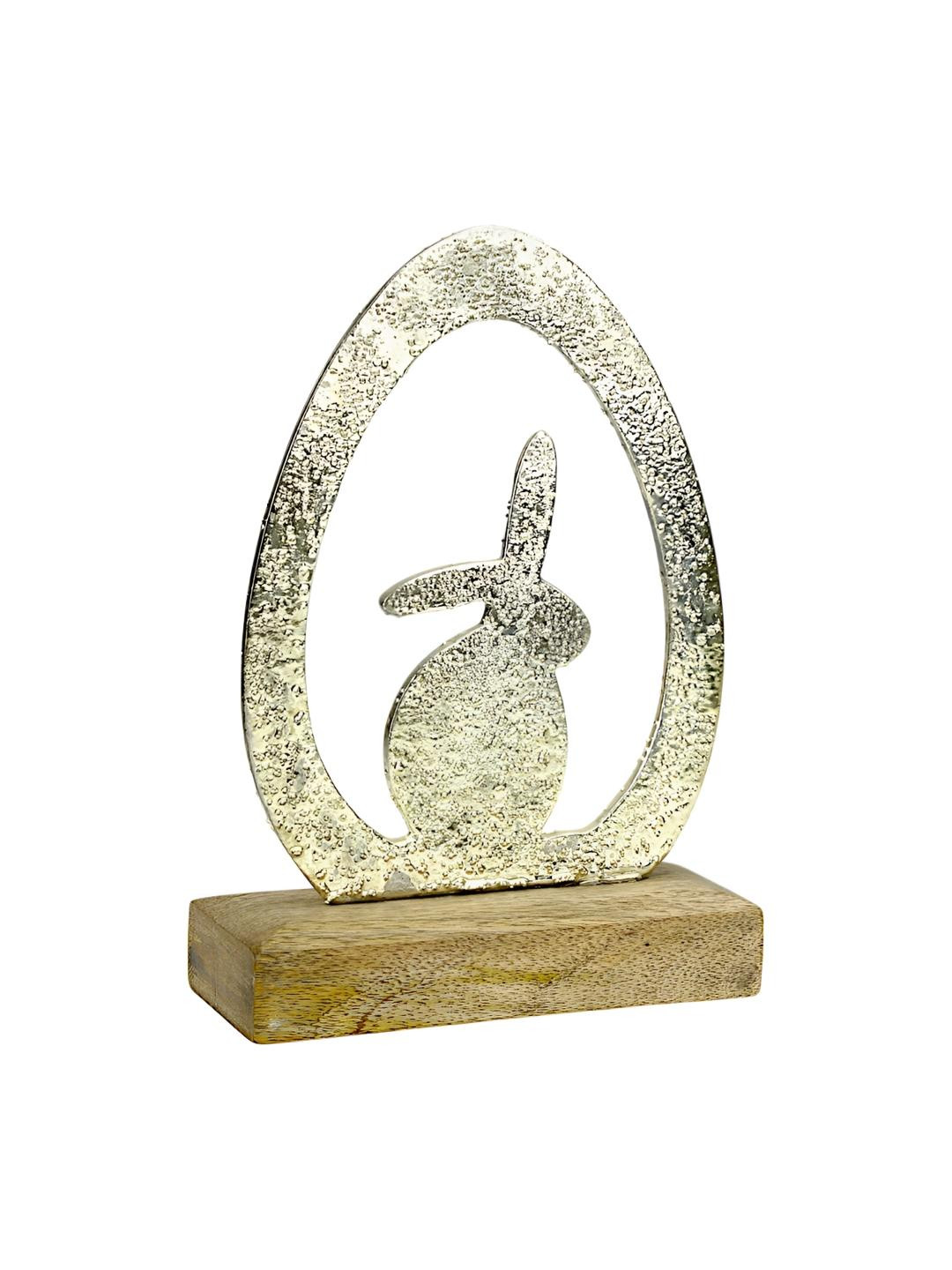 Tato stylová velikonoční dekorace ztvárňuje figurku králíka v siluetě vajíčka. Konbinuje přírodní materiály s moderním designem. Materiál, kovová část, často hliník se stříbrnnou antik úpravou je upevněná na masivním podstavci z mangového dřeva. Využití této moderní jarní a velikonoční dekorace je na stůl, komodu nebo okenní parapet. Výška je 23cm.