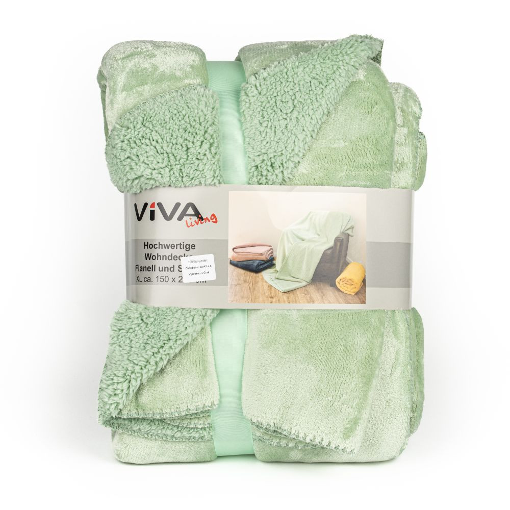 Deka z mikrovlákna s úpravou beránek v mintové barvě. Deka je oboustranná - jedna strana je hladká a druhá v úpravě imitace ovčí vlny. Je velmi hřejivá a příjemná na dotek. Je vhodná jako klasická deka nebo jako dekorativní přehoz na postel či pohovku. Rozměr je 150x200cm.
