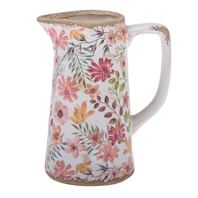 Dekorační keramická váza/džbán ve vintage stylu s pestrobarevným dekorem polních květin na krémovém podkladu s jemným patinováním a popraskaným vzhledem. Tento typ džbánu je určen především pro aranžmá ze suchých nebo umělých květin. Výška je 19cm.