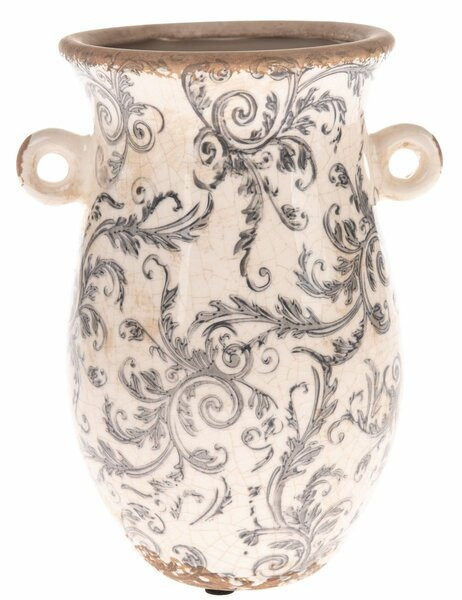 Dekorační keramická váza v krémové barvě s šedým rostlinným dekorem a výrazným patinováním (popraskanou strukturou). Výška je 20cm. Váza je vhodná zejména pro suché květinové vazby, nebo jako samostatná dekorace.