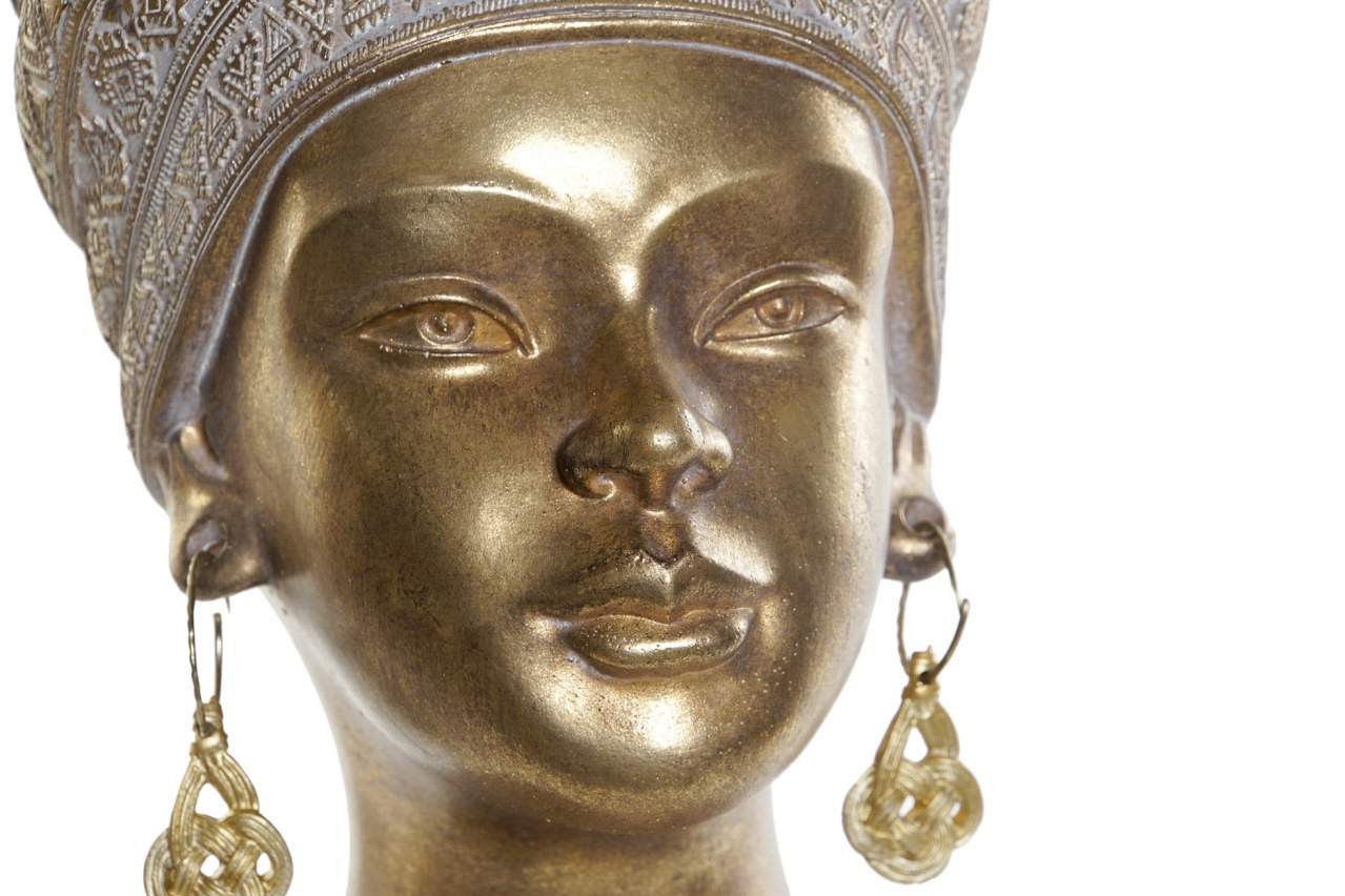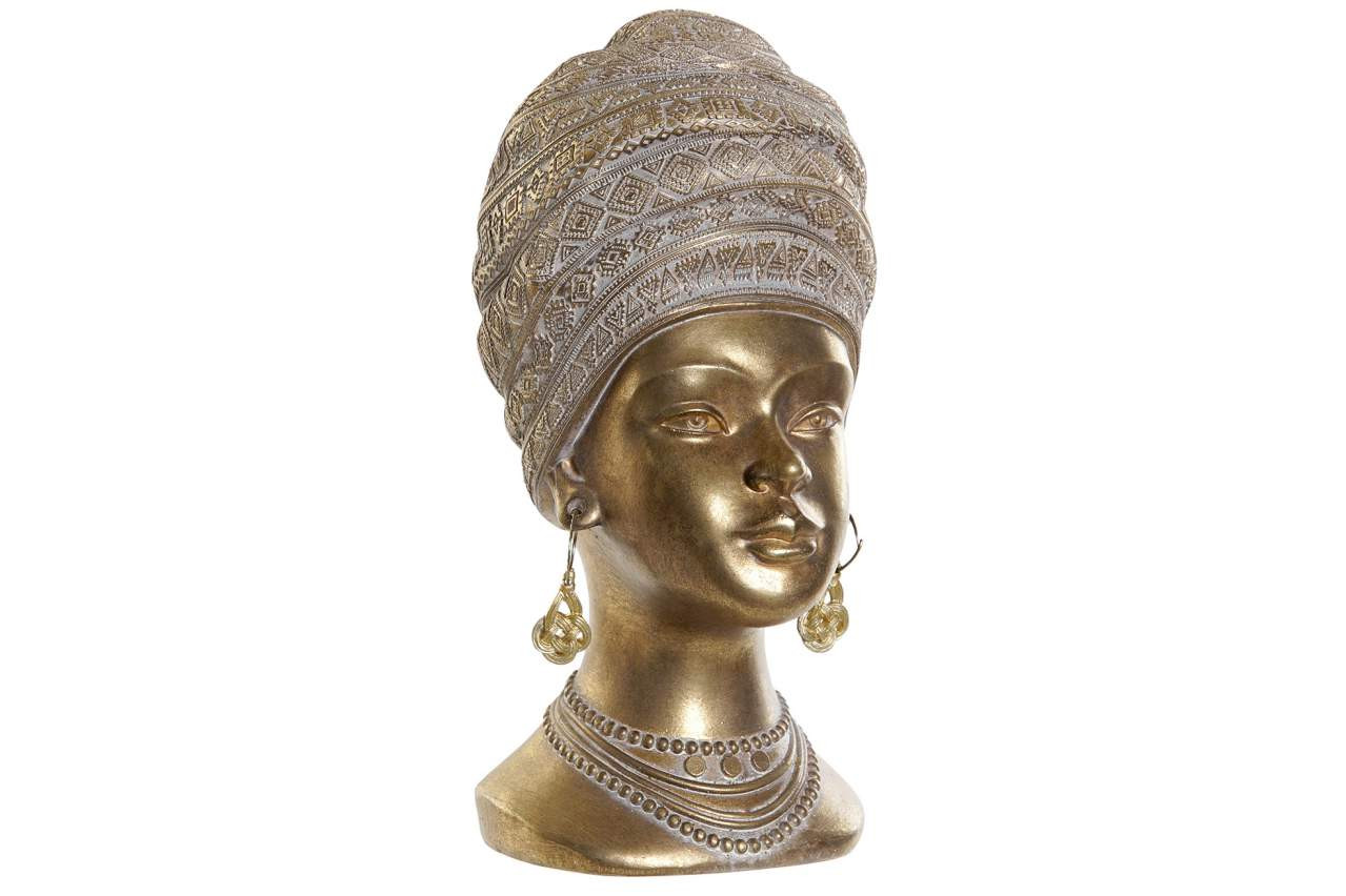 Tato dekorativní soška představuje hlavu afričanky s výrazným zdobeným turbanem ve zlaté barvě. Je vyrobena ze syntetické pryskyřice. Výška je 28cm.