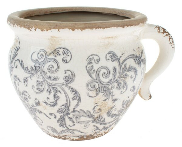 Dekorační keramický obal na květináč v krémové barvě s šedým rostlinným dekorem a výrazným patinováním (popraskanou strukturou). Výška je 10cm. Využití je jako obal na pokojové květiny, suché vazby nebo jako samostatná interiérová dekorace.