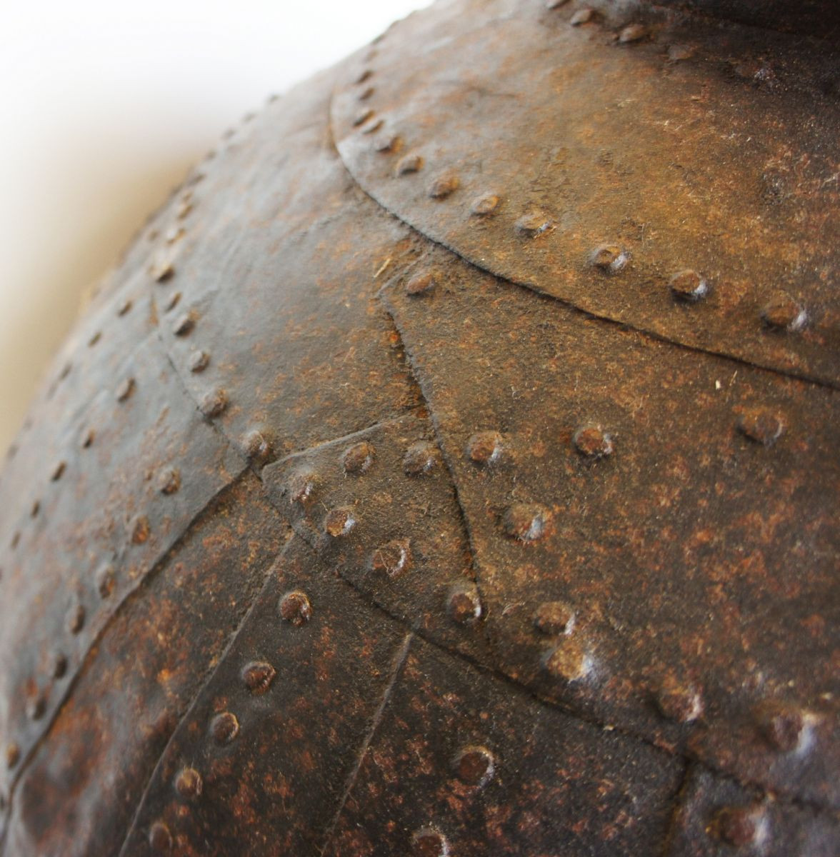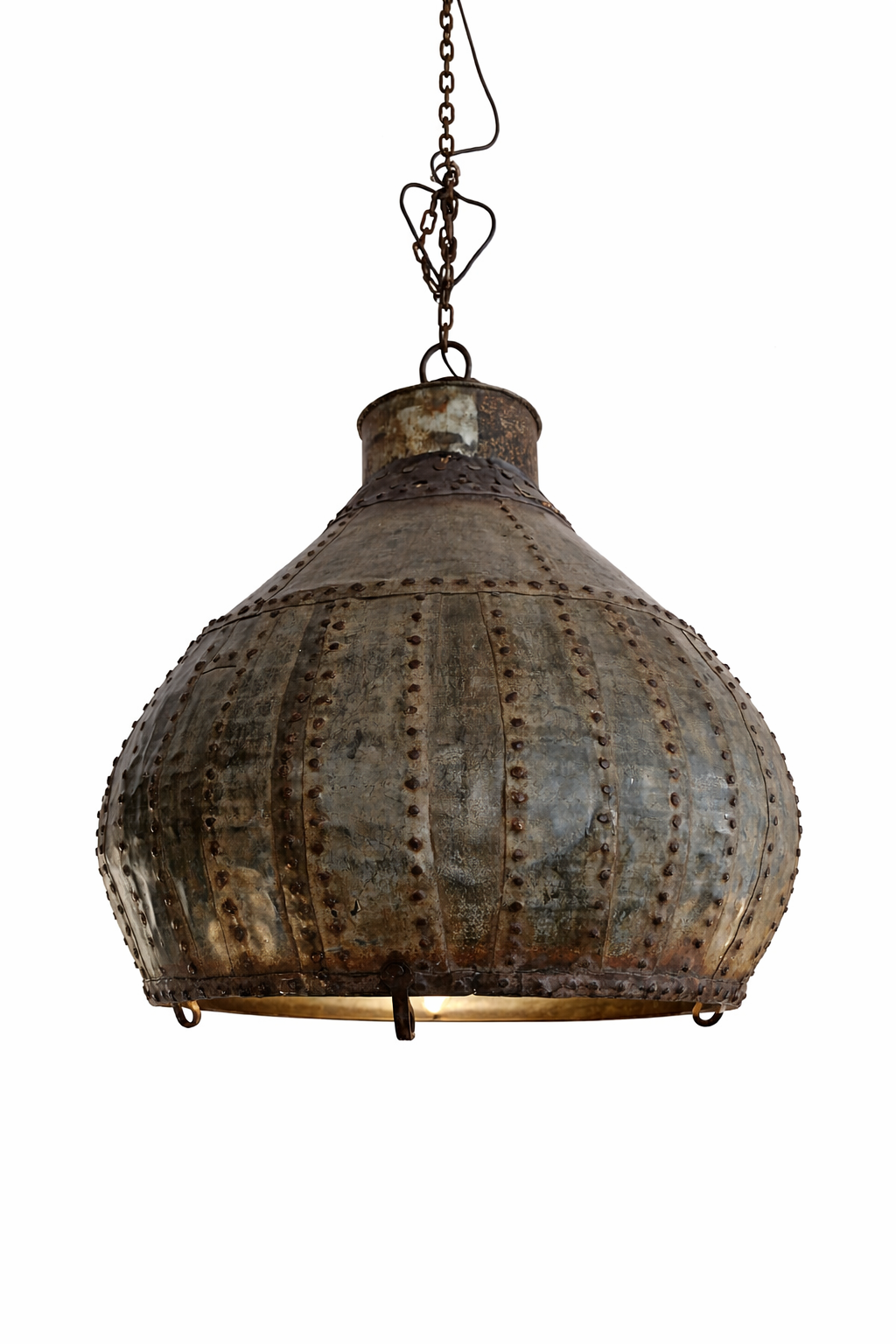 Kovový lustr v industriálním stylu, který zdobí výrazně nýtované plechy s patinou rzi nebo zvětralého bronzu. Díky svému vzhledu se skvěle hodí do interiérů v etno, vintage nebo industriálním stylu. Výška je 70cm a průměr 60cm.
