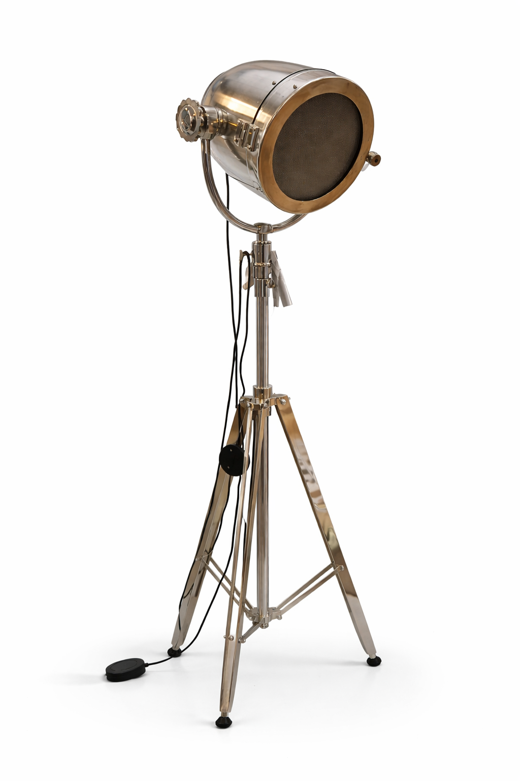 Industriální stojací lampa typu stativ, která svým designem připomíná filmové reflektory. Mateiál kov. Model umožnuje nastavit výšku stativu i úhel náklonu samotného svítidla. Výška 150cm.