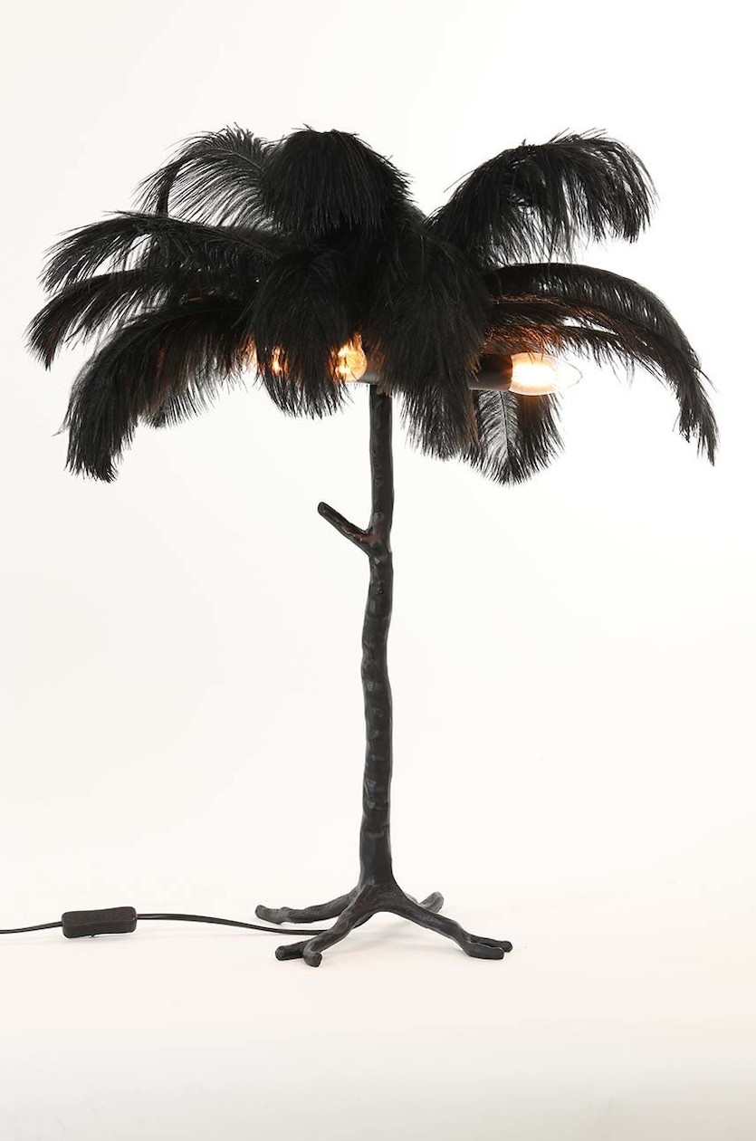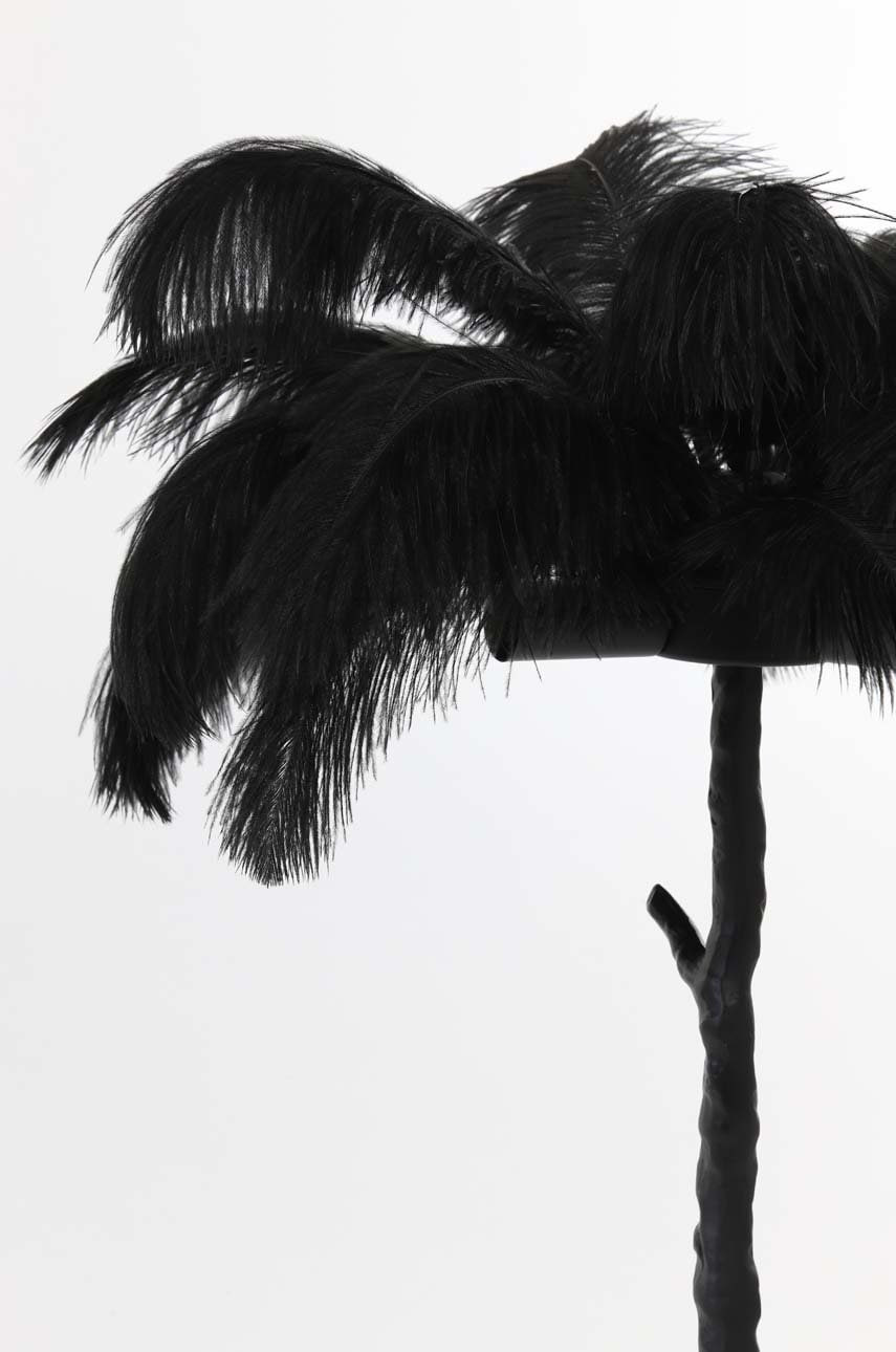 Lampa má stínidlo s černým peřím ve tvaru palmy, je styloým doplňkem v designu Art Deco nebo Glamour. Materiál kov a originální design pštrosích per. Výška je 65cm a šířka 50cm. Barva černá.