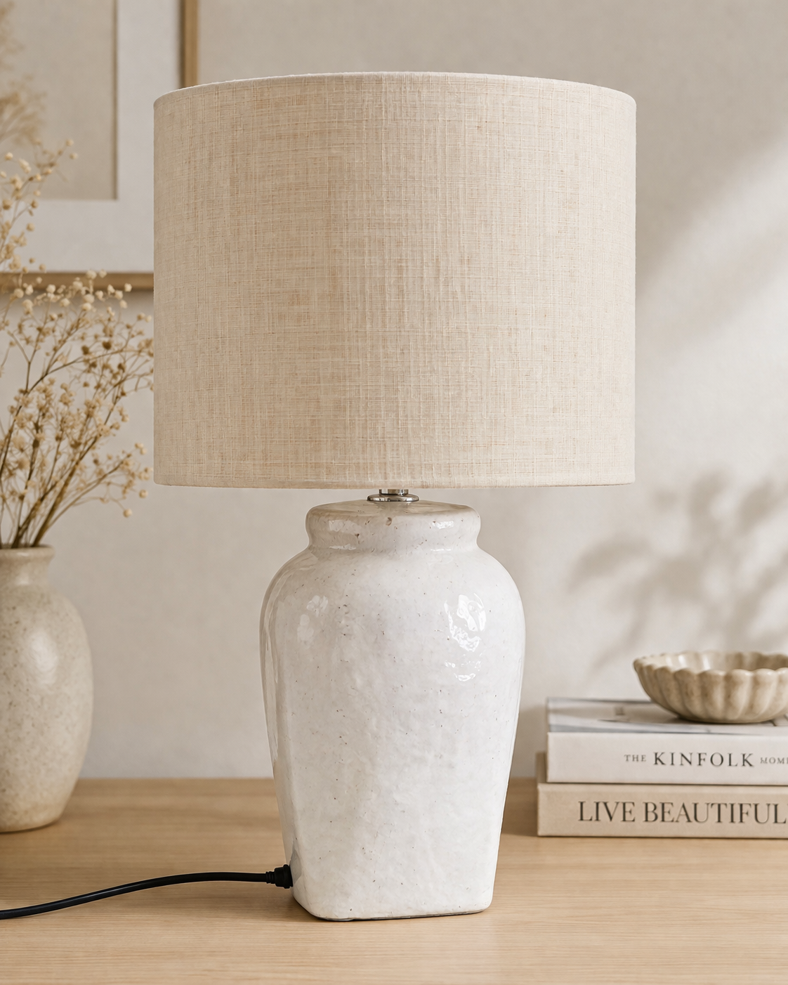 Stolní lampa s keramickým podstavcem a lněným stíndlem je oblíbeným prvkem v moderních interiérech. Lampa je vyhotovena ve světle béžové barvě. Výška je 55cm a průměr 30cm.