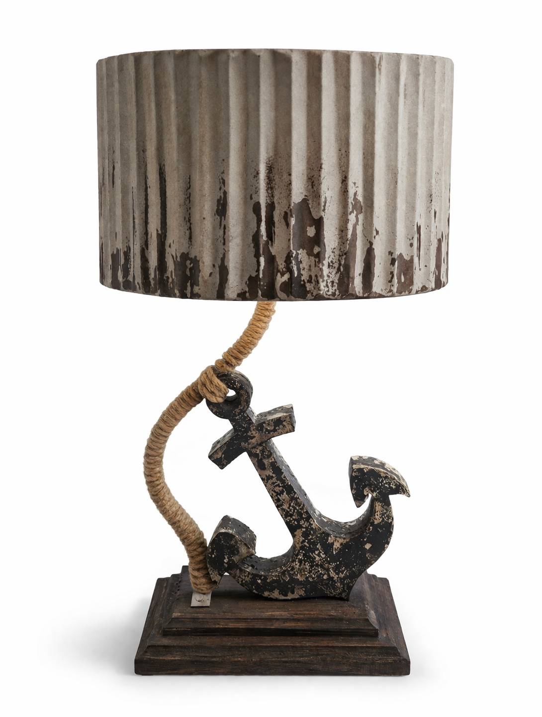 Stolní lampa Nautical je designový kousek v námořním a vintage stylu. Kombinuje podstavec z naplaveného dřeva, kotvy. Tělo je omotané jutovým lanem. Stínidlo má patinu připomínající starý kov. Výška je 72cm a průměr 37cm.
