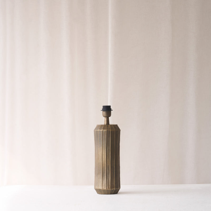 Stolní designová lamapa má podstavec s výraznou strukturou v barvě bronzu. Luxusní vzhled doplňuje černé sametové stínidlo, které má zevnitř zlatavý nádech. Je vhodná do moderních, vintage i art deco interiérů. Výška je 60cm a šířka 30cm.
