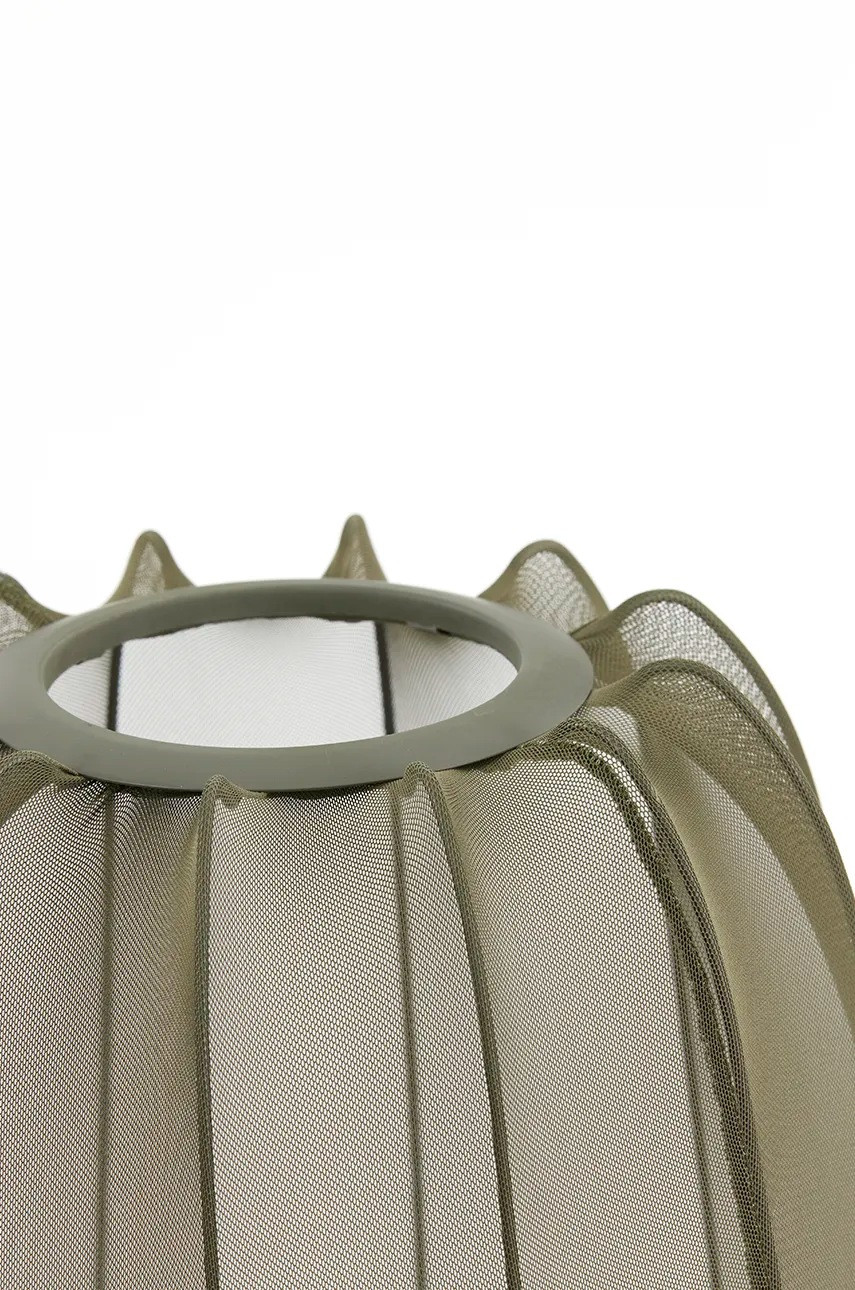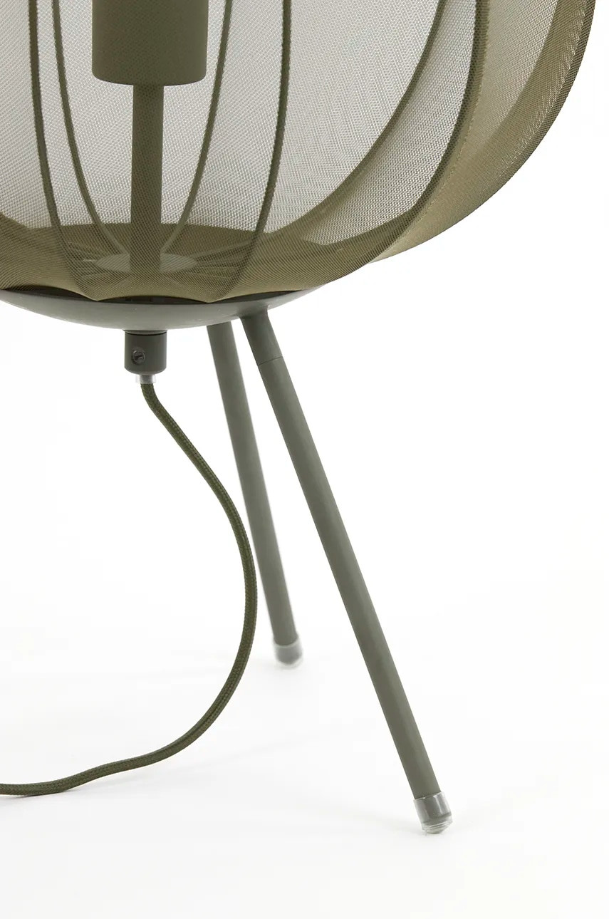 Stolní lampa Plumeria se vyznačuje industriálním a moderním designem s jemně průsvitným textilním stínidlem upevněným na kovovém rámu se třemi nohami. Materiál je kovová konstrukce v kombinaci s textilií (polyesterem). Výška 45cm a průměr 26cm.