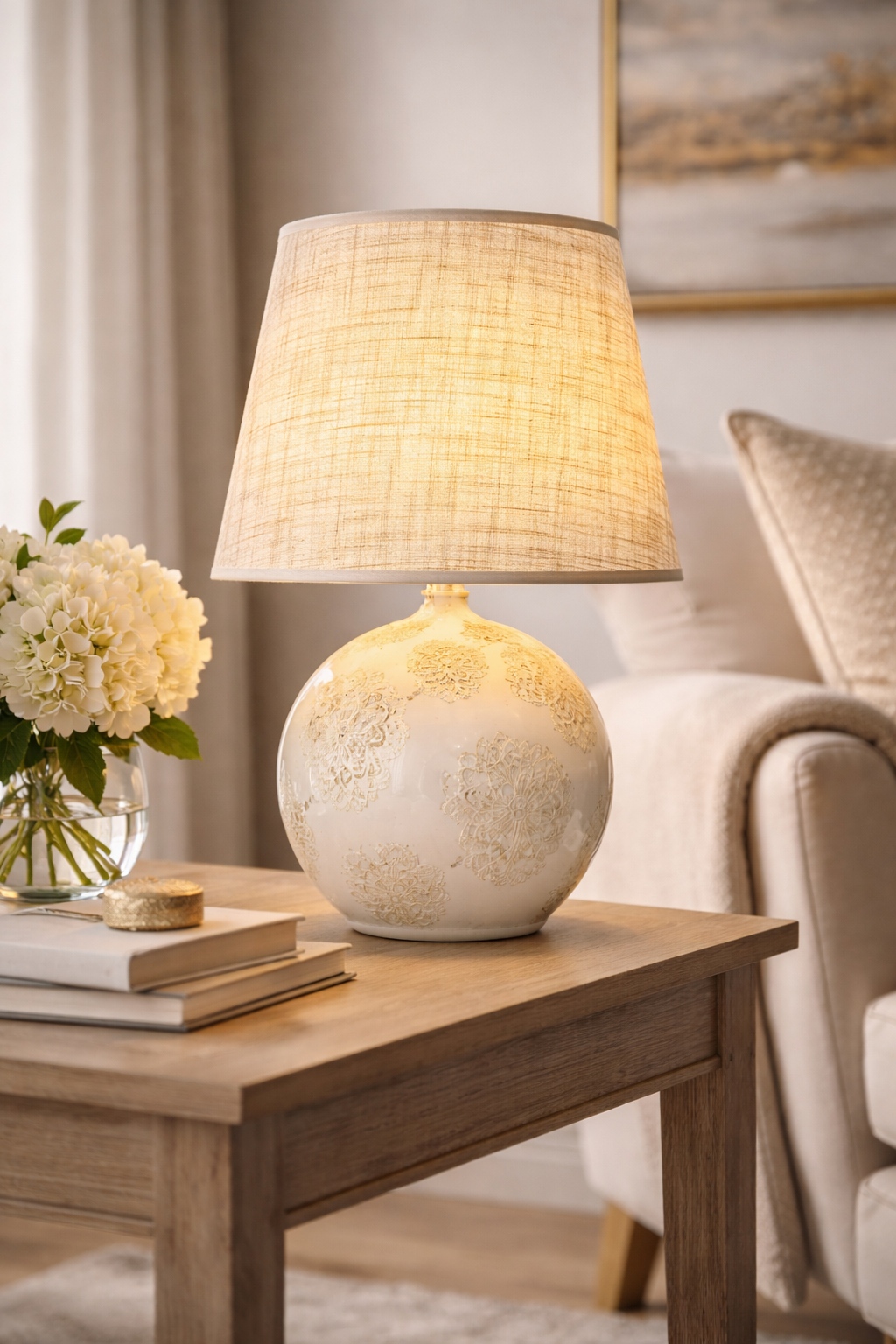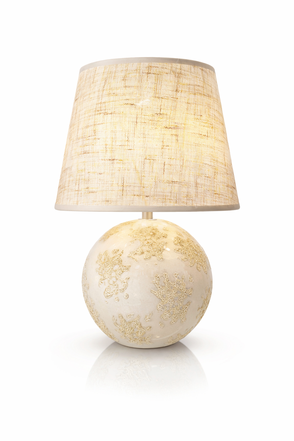 Keramická stolní lampa s béžovým stínidlem, vyniká svým elegantním s texturovaným designem, který se hodí do klasických i moderních interiérů. Lampa má kulatou keramickou základnu s derailním reliéfním vzorem a textilního stínítka, které zajišťuje příjemně rozptýlené světlo. Výška 38cm a průměr 25cm.